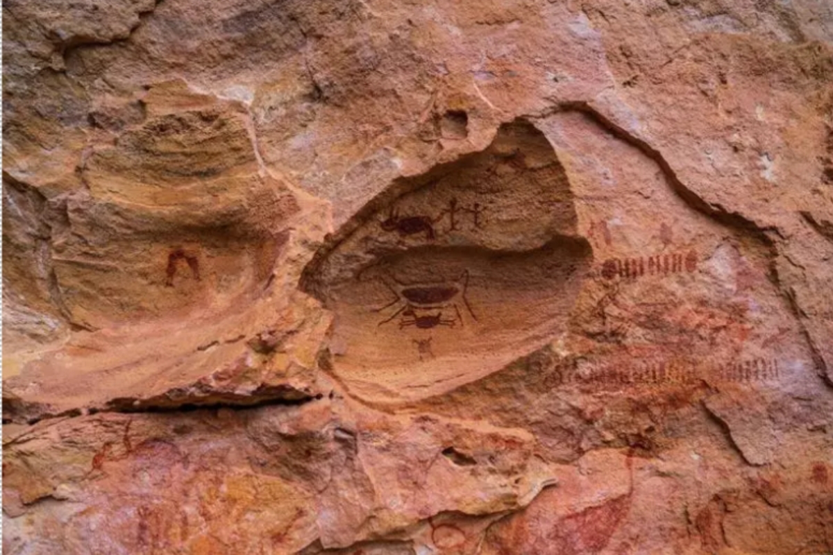 Pintura rupestre da Serra da Capivara, Brasil; a capivara no centro e, àesquerda, o famoso beijo