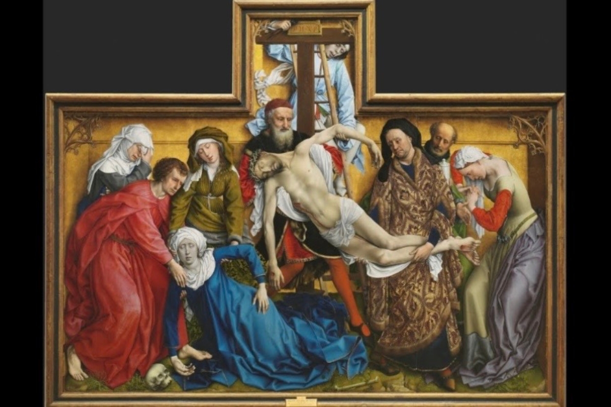 Em A Descida da Cruz, de Rogier van der Weyden, a dor é contida e organizada. O corpo de Cristo não despenca; é amparado. Os gestos são comedidos, quase silenciosos. Nada grita. A intensidade nasce do tempo que a imagem exige do observador.