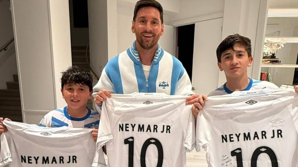 O carinho não se restringiu apenas ao astro argentino. Neymar fez questão de enviar kits também para os filhos do amigo, Thiago e Mateo, que apareceram na foto ao lado do pai, todos devidamente uniformizados com as cores do Alvinegro Praiano.