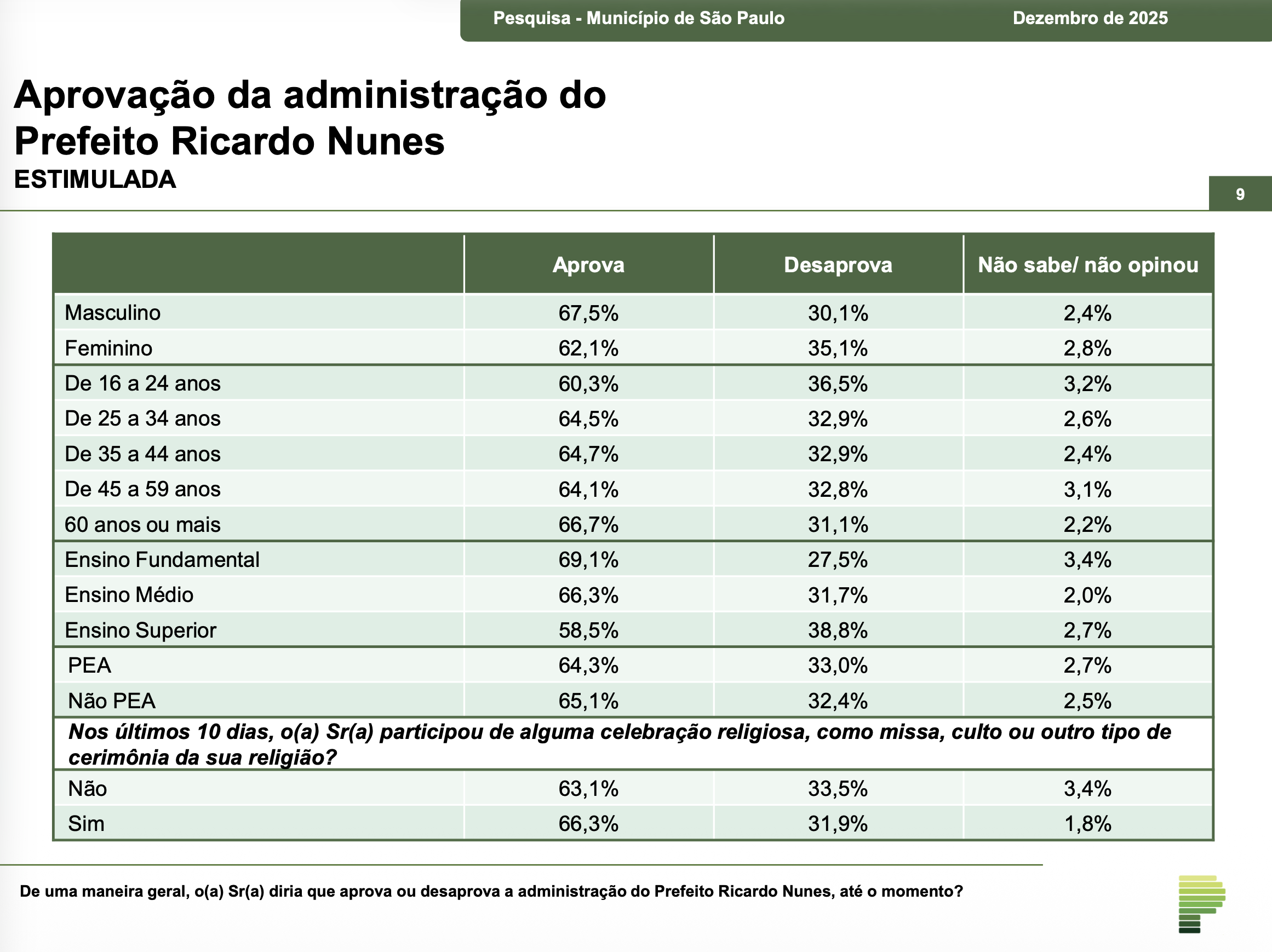 O apoio se distribui de forma equilibrada entre diferentes perfis de eleitores. Faixa etária, gênero, nível de escolaridade e condição econômica apresentam variações discretas, o que sugere uma aceitação ampla do governo municipal. Mesmo segmentos historicamente mais críticos mantêm maioria favorável à atual administração.