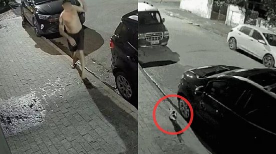 O ataque ao gatinho aconteceu bem cedo, por volta das 5h30 da manhã de segunda-feira (6). Nas gravações feitas por dois ângulos diferentes, dá para ver certinho quando o homem tira o calçado e joga com força na direção do animal. O bicho, assustado, correu para se esconder debaixo de um carro que estava parado na rua.