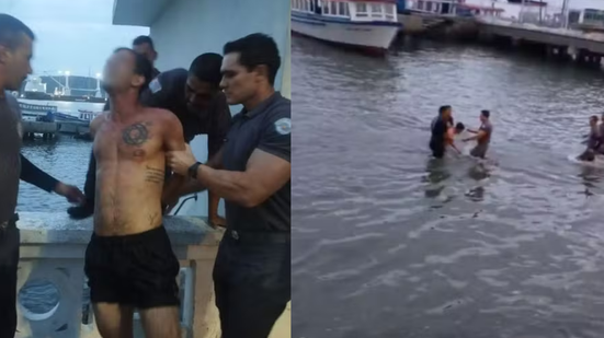 Sem ter como explicar a agressão ou as drogas, o homem tomou uma atitude radical. Ele subiu na mureta da orla e saltou na água, tentando fugir nadando. A ação mobilizou os policiais fardados e contou até com a ajuda de agentes à paisana que estavam por perto. O cerco foi fechado e ele foi retirado do mar algemado.
