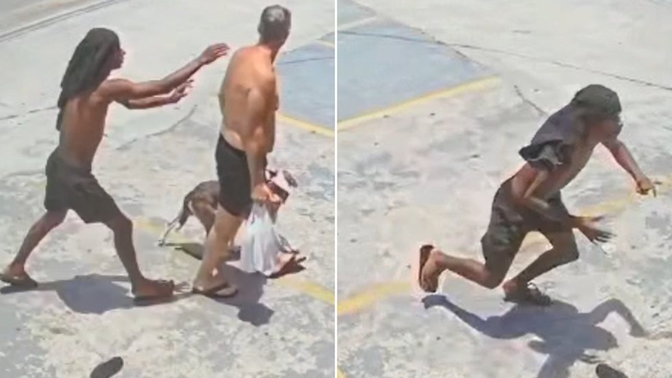 Câmera flagra ladrão arrancando corrente de homem que passeava com cachorro em Guarujá