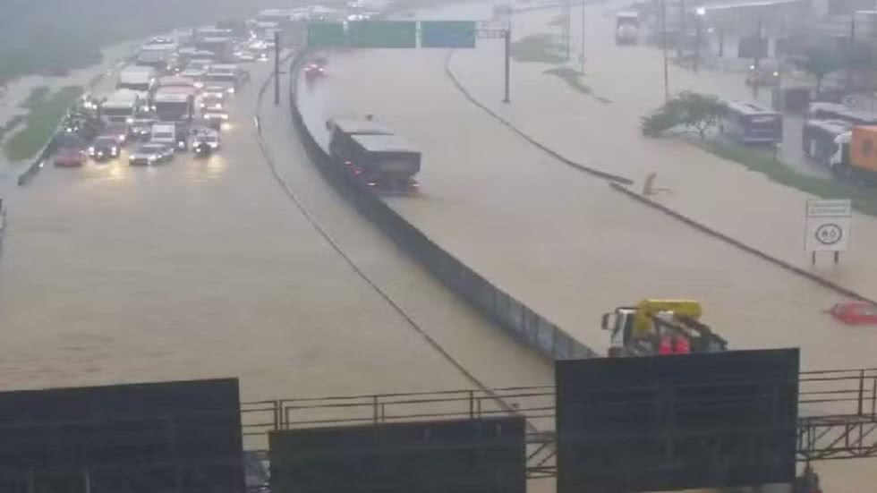 Chuva forte transborda córrego e causa 20 km de congestionamento em rodovia
