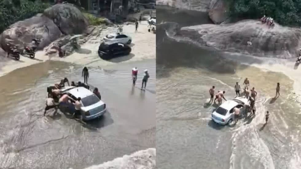 Carro atola na areia e precisa de ajuda de banhistas para sair na Praia do Perequê em Guarujá