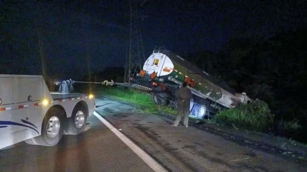 Após o susto com um besouro, o caminhão caiu em um barranco, mas felizmente não houve vazamento de combustível no local - Foto: Reprodução/ CCI Artesp